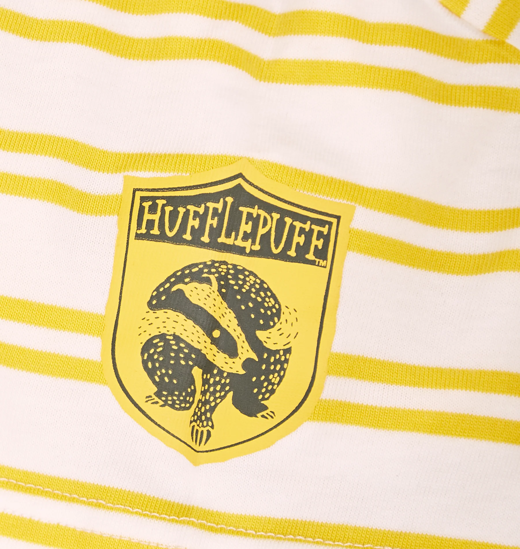 Unleash your little one's inner hero with this Hufflepuff Striped T-Shirt! This exclusive white tee features bold, horizontal stripes in Hufflepuff's signature yellow, perfect for any young wizard or witch. The standout detail? A super soft, high-pile fabric 'H' on the chest, complete with a charming embroidered Golden Snitch, adding a magical touch of texture and fun. Plus, the printed Hufflepuff crest on the right shoulder proudly displays the house's loyal badger mascot.