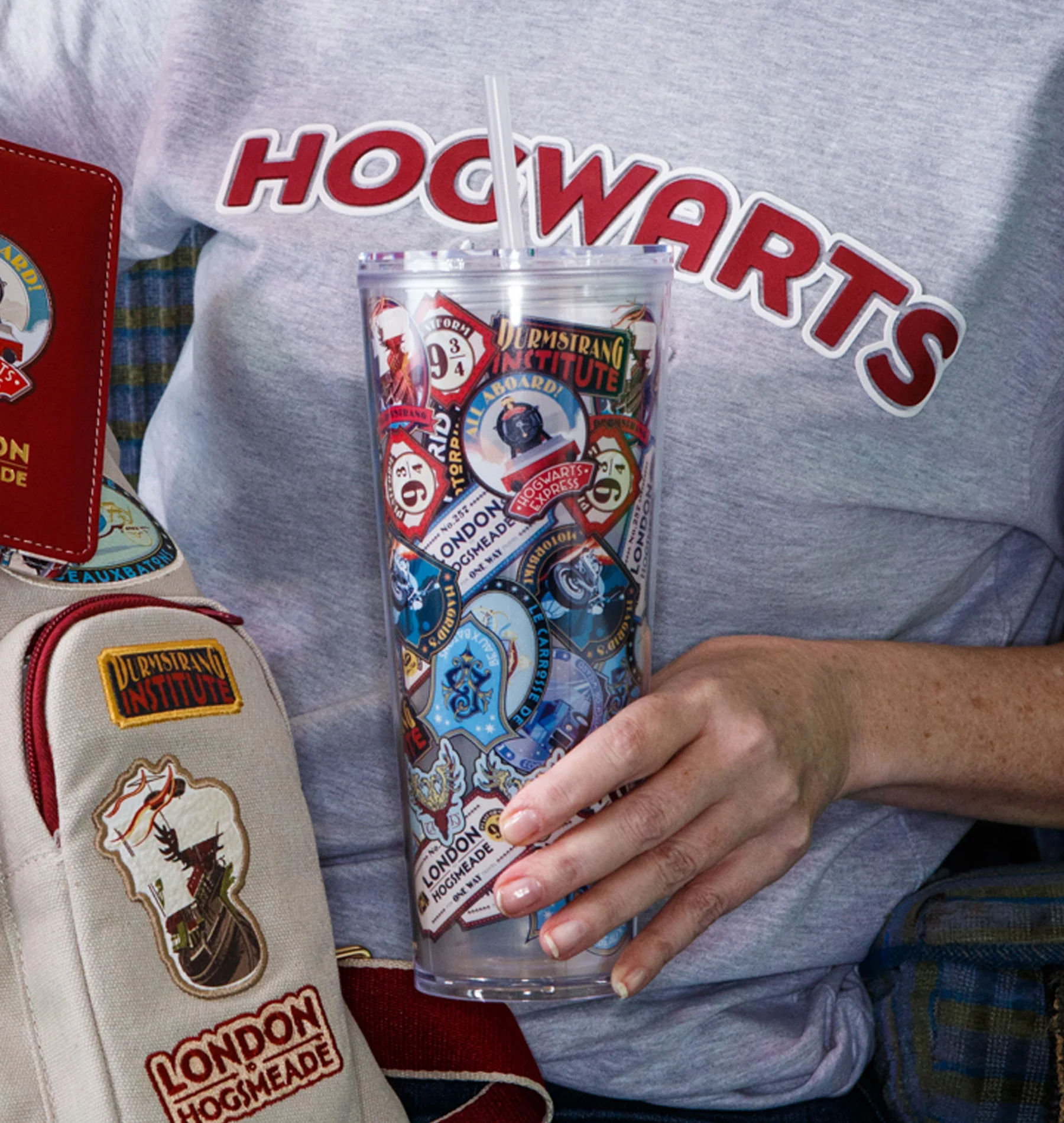 Quench your thirst for adventure with our delightful travel cup. Adorned in a vibrant all-over print, it showcases the iconic badges of Hogwarts Express and Hogwarts School, Beauxbatons, and Durmstrang, encapsulating the spirit of wizarding education. Crafted from durable plastic, it's perfect for on-the-go enchantment.